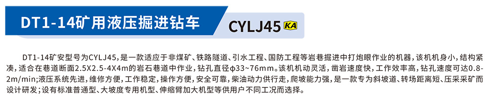 DT1-14礦安型號(hào)為CYLJ45,是一款適應(yīng)于非煤礦、鐵路隧道、引水工程、國防工程等巖巷掘進(jìn)中打炮眼作業(yè)的機(jī)器,該機(jī)機(jī)身小,結(jié)構(gòu)緊湊,適合在巷道斷面2.5X2.5-4X4m的巖石巷道中作業(yè),鉆孔直徑φ33~76mm。該機(jī)機(jī)動(dòng)靈活,鑿巖速度快,工作效率高,鉆孔速度可達(dá)0.8.2m/min;液壓系統(tǒng)先進(jìn),維修方便,工作穩(wěn)定,操作方便,安全可靠,柴油動(dòng)力供行走,爬坡能力強(qiáng),是一款專為斜坡道、轉(zhuǎn)場(chǎng)距離短、壓采采礦而設(shè)計(jì)研發(fā):設(shè)有標(biāo)準(zhǔn)普通型、大坡度專用機(jī)型、伸縮臂加大機(jī)型等供用戶不同工況而選擇。