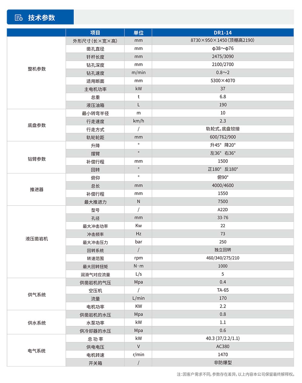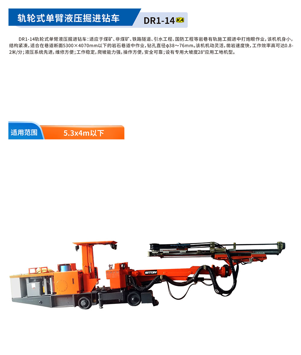 DR1-14軌輪式單臂液壓掘進(jìn)鉆?:適應(yīng)于煤礦、?煤礦、鐵路隧道、引??程、國防?程等巖巷有軌施?掘進(jìn)中打炮眼作業(yè),該機(jī)機(jī)??,結(jié)構(gòu)緊湊,適合在巷道斷?5300×4070mm以下的巖?巷道中作業(yè),鉆孔直徑φ38?76mm。該機(jī)機(jī)動靈活,鑿巖速度快,?作效率?可達(dá)0.8-2?/分;液壓系統(tǒng)先進(jìn),維修?便;?作穩(wěn)定,爬坡能?強(qiáng),操作?便,安全可靠;設(shè)有專??坡度28°應(yīng)??地機(jī)型。