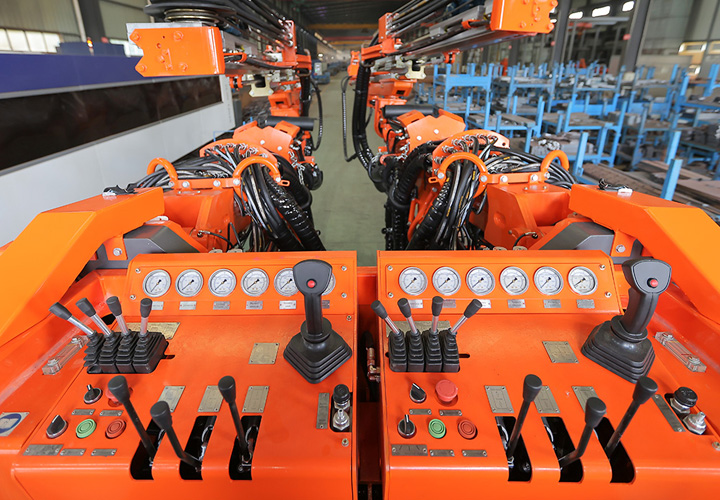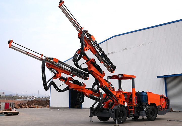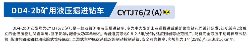 DD4-2b礦安型號(hào)為CYTJ76/2(A),是一款雙臂礦用液壓掘進(jìn)鉆車(chē),專(zhuān)為中大型礦山巷道掘進(jìn)或采礦鑿巖鉆孔而設(shè)計(jì)研發(fā),該機(jī)設(shè)有2套獨(dú)立的全液壓驅(qū)動(dòng)鑿巖系統(tǒng),互不影響,配備大功率鑿巖機(jī),鑿巖速度可達(dá)0.8-2.5米/分鐘,適應(yīng)圍巖等級(jí)范圍廣,配有完全液壓平動(dòng)可伸縮式鉆降,柴油機(jī)四輪四驅(qū)動(dòng)輪胎式餃接底盤(pán),全濕式車(chē)橋底盤(pán)系統(tǒng)雙路制動(dòng)控制系統(tǒng),安全可靠性高,爬坡能力 14°(25%),行走速度16km/h。