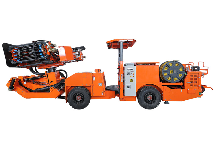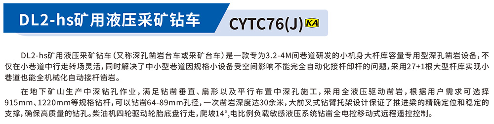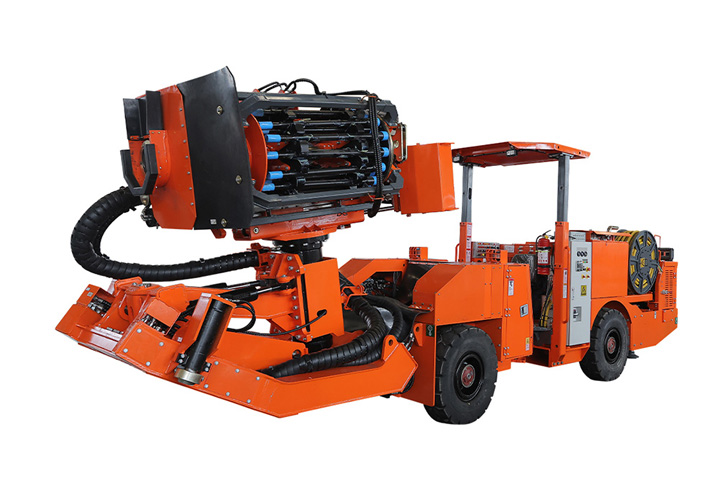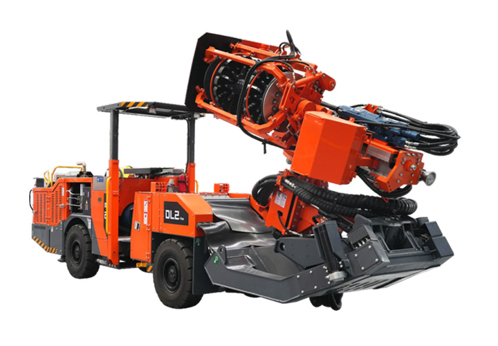 DL2-hs礦用液壓采礦鉆車(又稱深孔鑿巖臺(tái)車或采礦臺(tái)車)是一款專為3.2-4M間巷道研發(fā)的小機(jī)身大桿庫(kù)容量專用型深孔鑿巖設(shè)備,不僅在小巷道中行走轉(zhuǎn)場(chǎng)靈活,同時(shí)解決了中小型巷道因規(guī)格小設(shè)備受空間影響不能完全自動(dòng)化接桿卸桿的問(wèn)題,采用27+1根大型桿庫(kù)實(shí)現(xiàn)小巷道也能全機(jī)械化自動(dòng)接桿鑿巖。在地下礦山生產(chǎn)中深鉆孔作業(yè),滿足鉆鑿垂直、扇形以及平行布置中深孔施工,采用全液壓驅(qū)動(dòng)鑿巖,根據(jù)用戶需求可選擇915mm、1220mm等規(guī)格鉆桿,可以鉆鑿64-89mm孔徑,一次鑿巖深度達(dá)30余米,大前又式鉆臂托架設(shè)計(jì)保證了推進(jìn)梁的精確定位和穩(wěn)定的支撐,確保高質(zhì)量的鉆孔。柴油機(jī)四輪驅(qū)動(dòng)輪胎底盤行走,爬坡14”,電比例負(fù)載敏感液壓系統(tǒng)鉆鑿全電控移動(dòng)式遠(yuǎn)程遙控控制。
