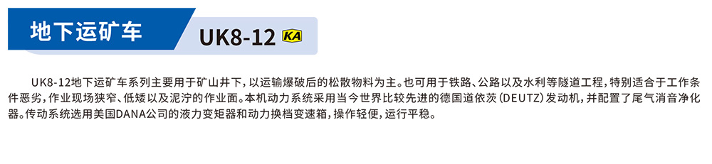 UK8-12地下運(yùn)礦車系列主要用于礦山井下,以運(yùn)輸爆破后的松散物料為主。也可用于鐵路、公路以及水利等隧道工程,特別適合于工作條件惡劣,作業(yè)現(xiàn)場(chǎng)狹窄、低矮以及泥濘的作業(yè)面。本機(jī)動(dòng)力系統(tǒng)采用當(dāng)今世界比較先進(jìn)的德國(guó)道依茨(DEUTZ)發(fā)動(dòng)機(jī),并配置了尾氣消音凈化器。傳動(dòng)系統(tǒng)選用美國(guó)DANA公司的液力變矩器和動(dòng)力換檔變速箱,操作輕便,運(yùn)行平穩(wěn)。