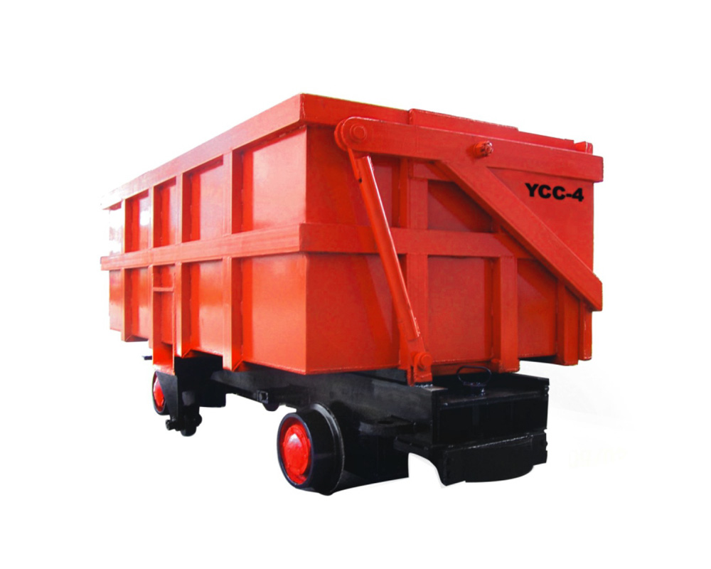 曲軌式側(cè)卸翻斗礦車,是在礦車行進過程中,由卸載輪臂經(jīng)過卸載曲軌來實現(xiàn)車箱自動傾翻卸料和自動復(fù)位,卸礦是在機車牽引下,當(dāng)卸載輪爬上曲軌時,車箱翻轉(zhuǎn),車門自動打開實現(xiàn)卸料,車走過曲軌后車箱恢復(fù)原位,車門自動鎖固。